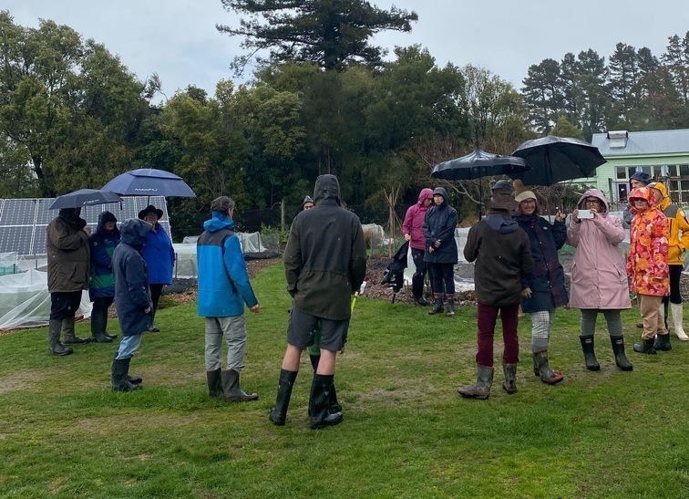 Soon we were standing in the ngahere (forest), a boundary shelter patch planted up with natives that were clearly thriving in each other's company, bringing the native birds to the whenua. We walked through a wide mowed garden path with 54 covered “crop circles” full of vegetables on either side of us
